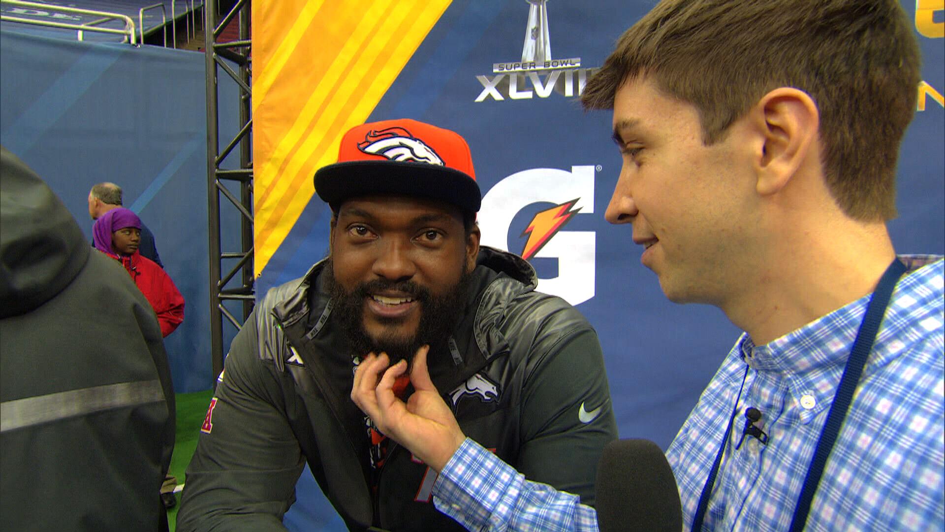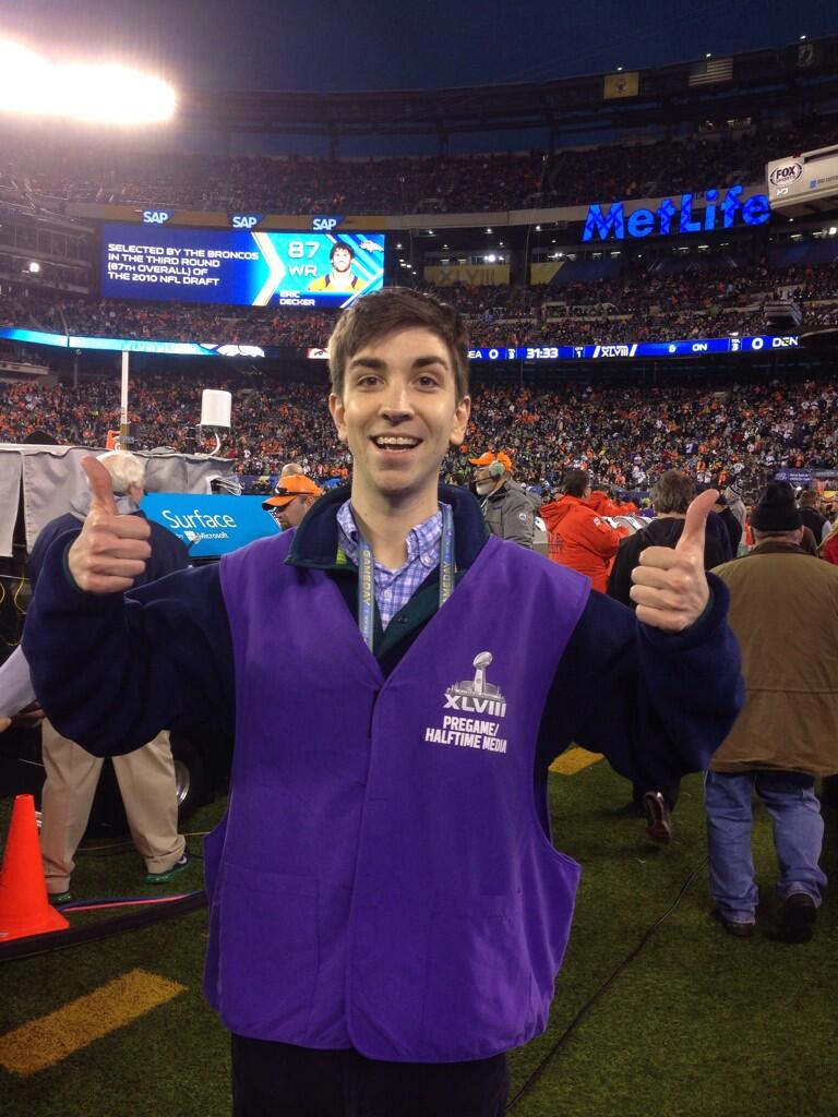 - February 15, 2014: Cue card guy Todd Seda, as Todd the Intern, did a great job with "Biff duty" at the Super Bowl media day (video) and game (video). Here are links to Todd's pics, tweeted from @LateShow: Winston Justice, Seahawks & Broncos fans, Broadway Joe Namath, Seahawks mascot and on the field.